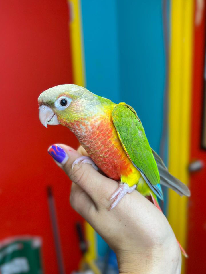 Green Cheek Conures are one of the most popular conure species due to their huge personalities packed into such a small body. They are playful, curious, and often a little sassy, but also incredibly affectionate and people oriented. Green Cheeks tend to form strong bonds with their owners and enjoy being involved in daily activities, whether that’s hanging out on your shoulder, exploring their surroundings, or simply being nearby. They are known for being intelligent, engaging, and full of character, which makes them a favorite among both first time bird owners and experienced parrot keepers. They also have the ability to pick up a few words too! All babies are DNA sexed with certification and will come with a small amount of food to help transition to your preferred diet. Weaned on a custom blend that includes pellets, dry seed mix, dried fruit & nut mix, and a blend of herbs for a healthy start. They also receive fresh chop and sprouted seeds on occasion.